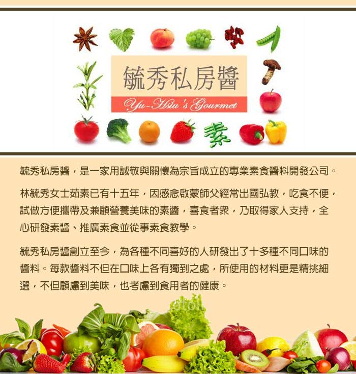 毓秀私房醬,是一家用誠敬與關懷為宗旨成立的專業素食醬料開發公司。